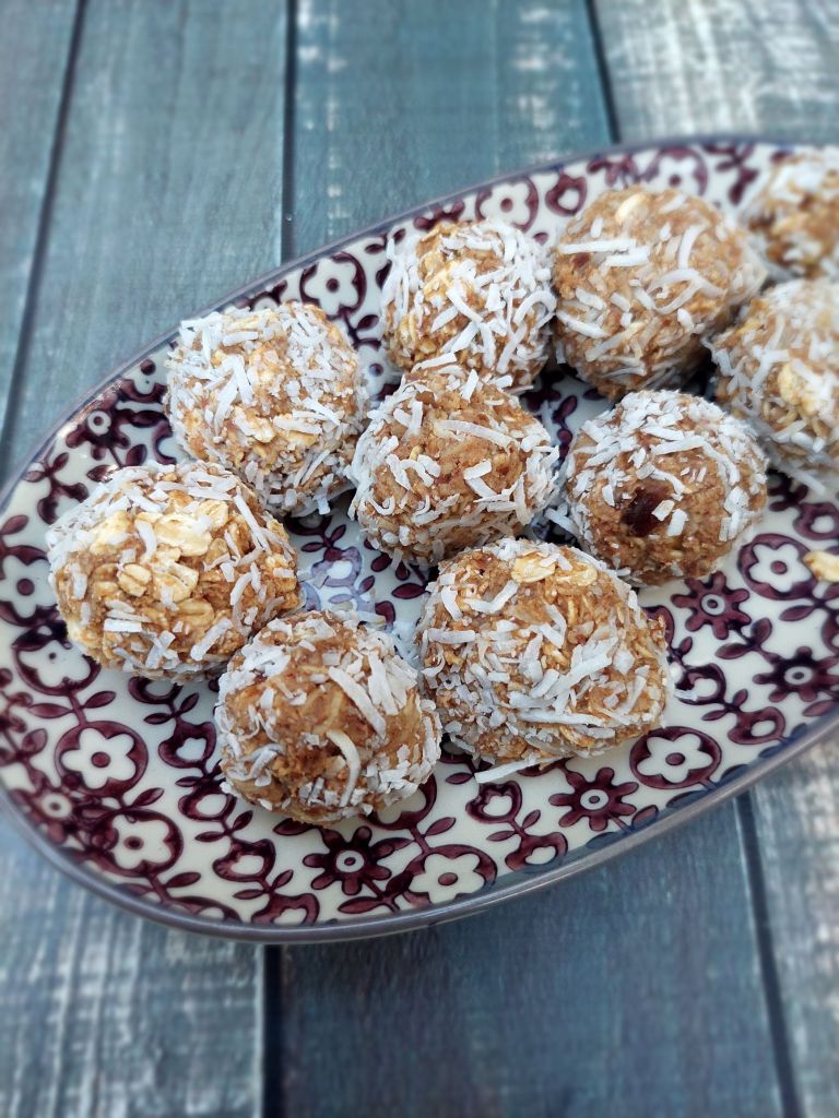 Roll into balls (roughly 22-28 depending on size) and roll in more coconut or oats as desired. Pop into fridge or freezer until ready to eat.