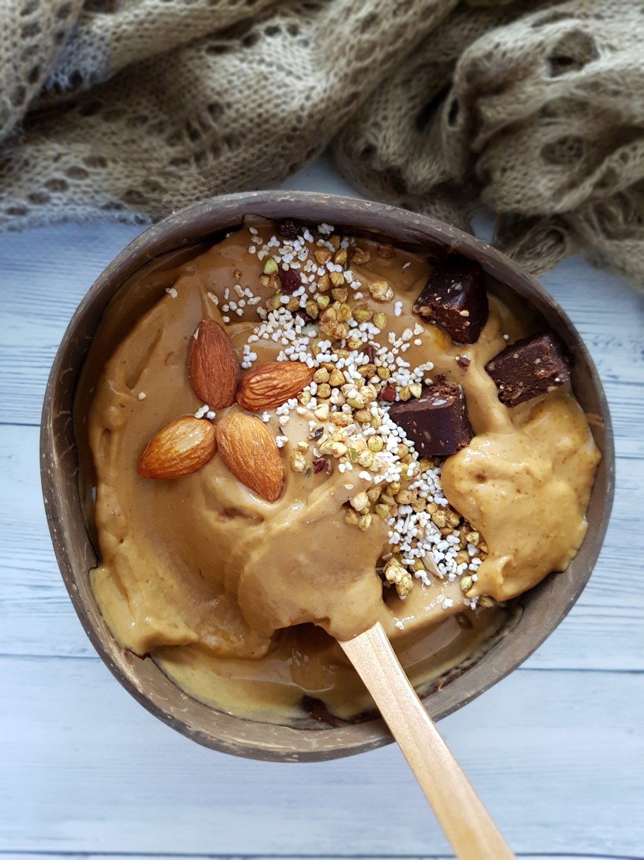 The secret ingredient is my newly found favourite ingredient – guar gum! It is a completely natural low-carb binder that provides a luscious and viscous texture to anything from smoothies, puddigs and oatmeal to soups, sauces, and homemade icecream. More recipes featuring guar gum will follow but it truly is a game changer if you like your smoothies thick! Plus, you don’t need frozen bananas, yogurt or icecream to get this a dreamy creamy milkshake-y texture.
