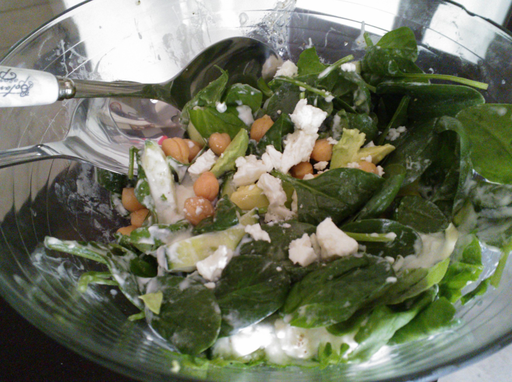1 large cucumber, washed and cubed 100 g spinach, silverbeet or kale, washed and roughly chopped 2 handfulls of watercress, washed and roughly chopped 1/2 Hass avocado, cubed 10 olives 2 tbsp chickpeas 60 g fetta or chèvre 250 g goat or sheep yoghurt, strained 2 tbsp extra virgin olive oil 2 tbsp lemon juice salt and pepper parsley, basil and mint to taste