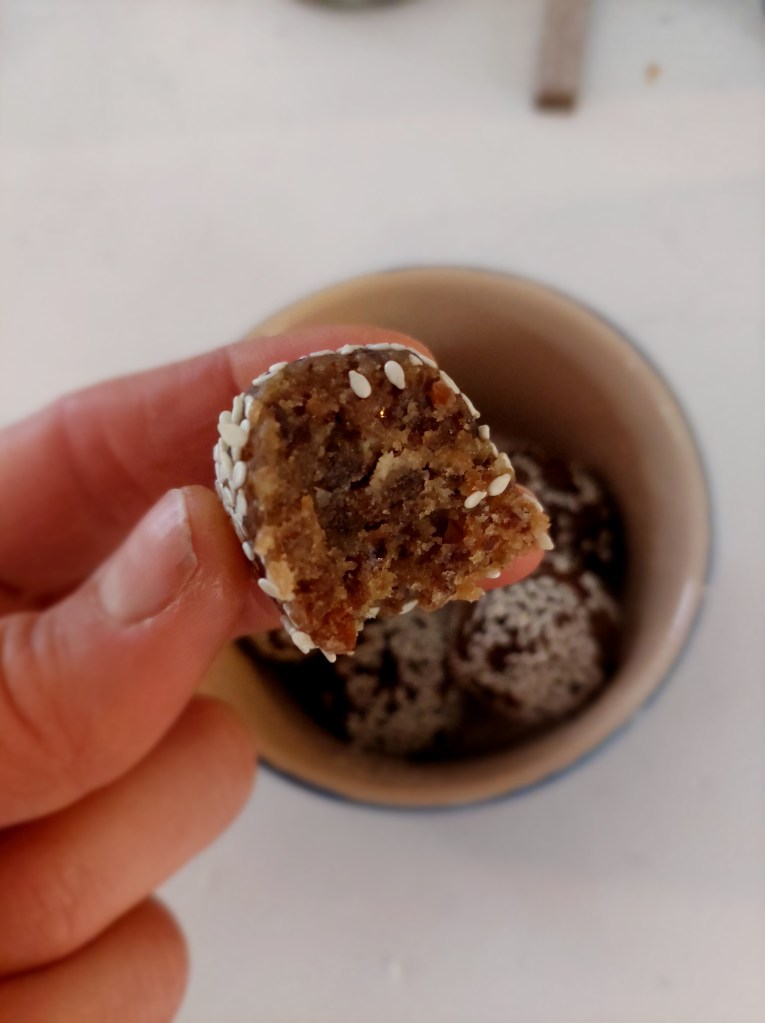 One cup packed, pitted, chopped dates One cup oats, preferably ground 2 tbsp cacao 2 tbsp tahini 4 tbsp sesame seeds