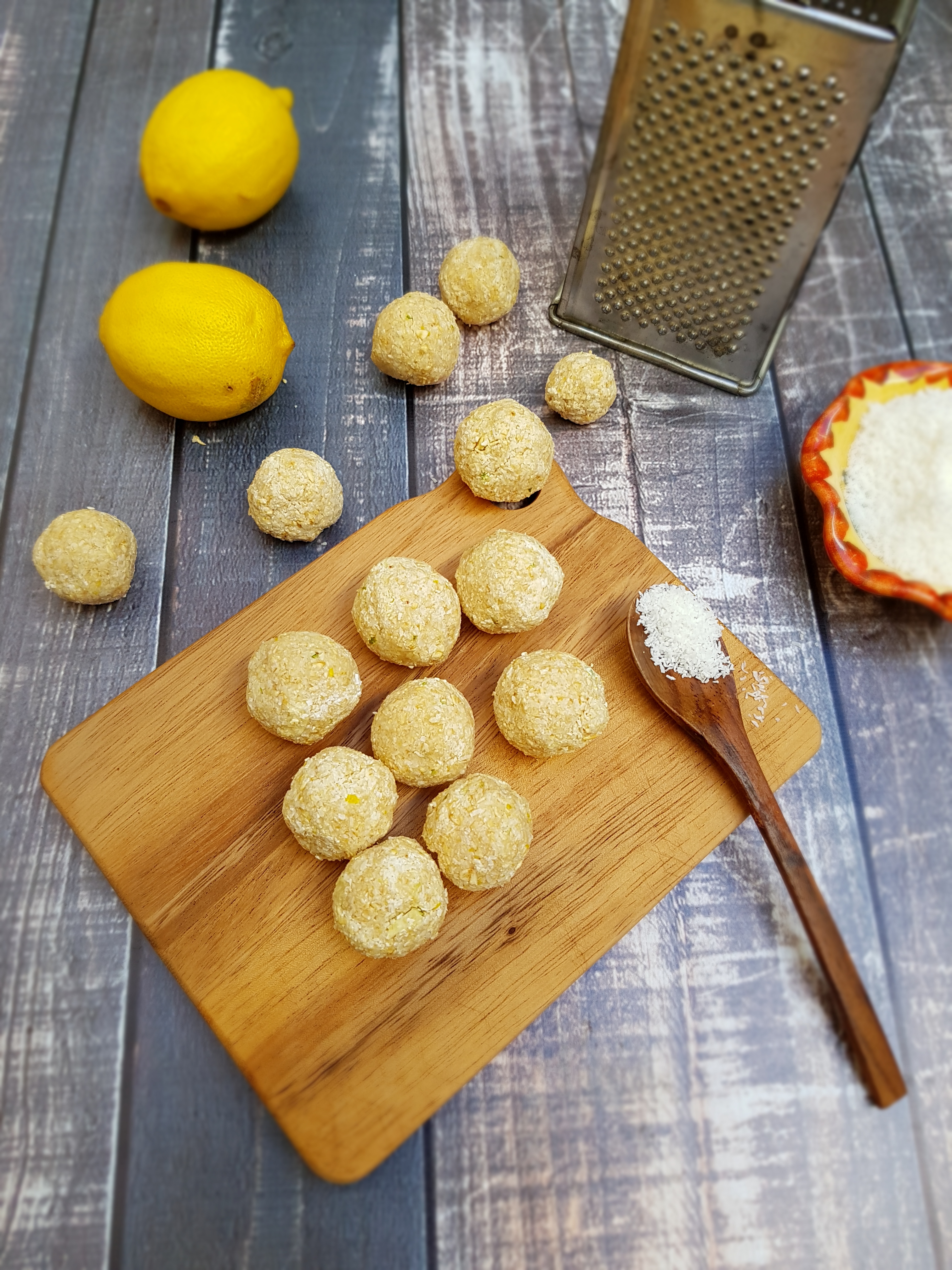 If you love bliss balls, there is no shortage of recipes on the internet, including my blog. Whether you feel like carrot cake, lamington, cookie dough, baklava or ginger bread, I have you covered. Only missing are cheesecake blissballs and black forest bliss balls, and I can offer you a whole patisserie in bliss ball shape! So here is the latest creation…drumroll…Lemon Meringue Bliss Balls!
