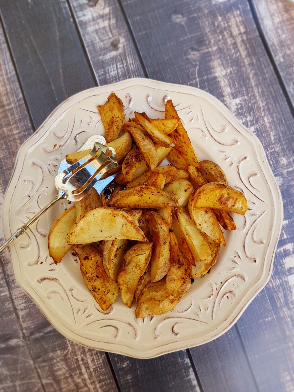 I loooove potatoes. Seriously. They are so much more than a side dish. Not only do they taste delicious, they are so filling and satisfying that they make for a complete meal. I love them in any state – boiled, baked, roasted, mashed, fried…but they are at their best in the form of chips or wedges. Now, if this sounds greasy and unhealthy to you, dripping with trans fats and all sorts of nasties, hear me out. It is possible to achieve the perfect crispy oil-free potato wedges. No oil and no deep-frying required!